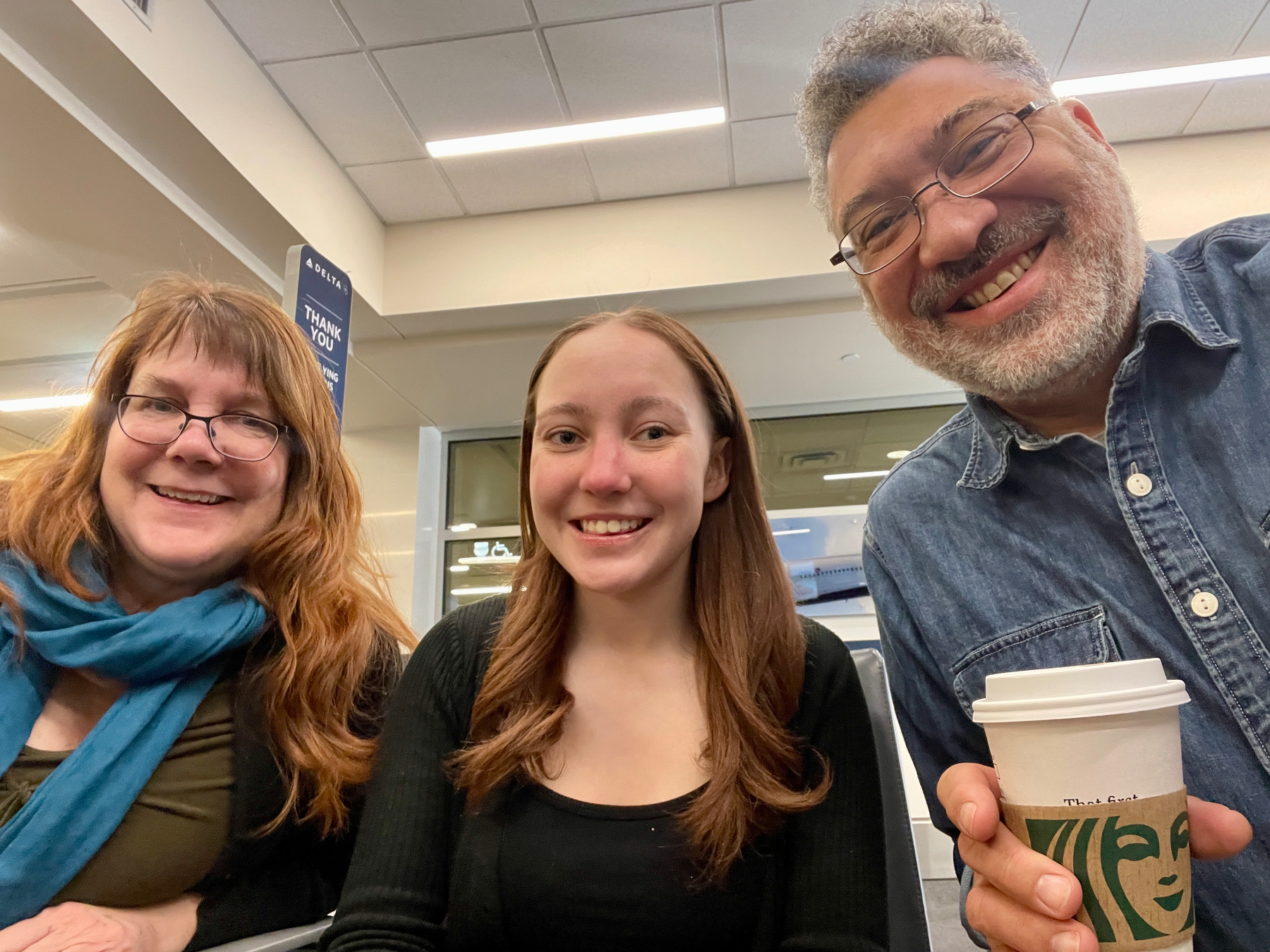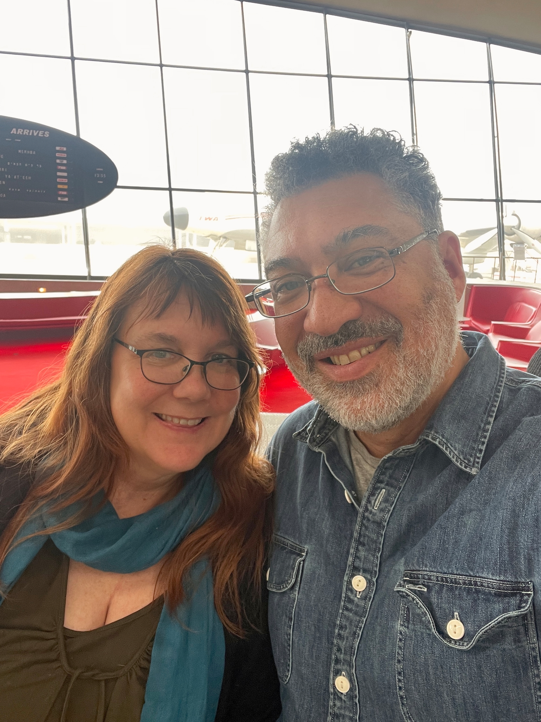 Having a blast on our layover at the beautifully restored TWA Terminal at JFK with our friend Dawn (who lives in Brooklyn and came out to meet us).